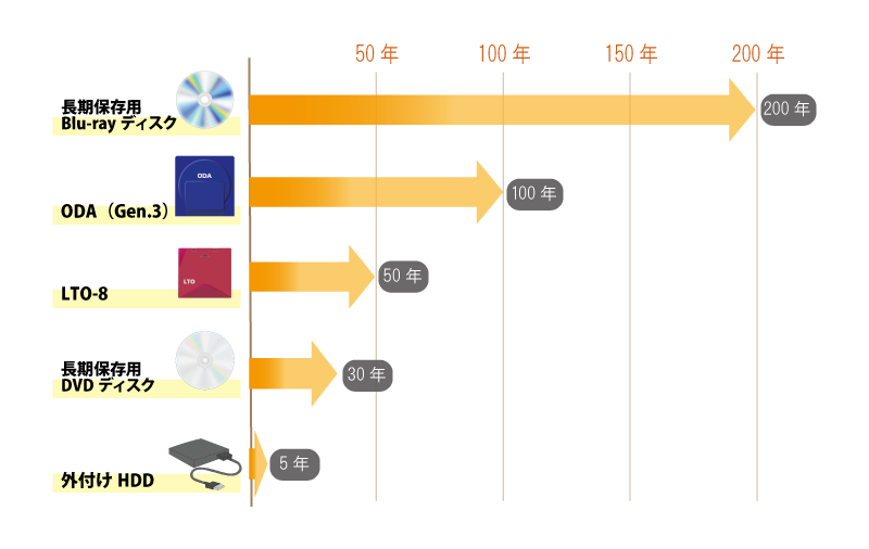 データマイグレーション先として候補に挙がるのが、ODAやLTOなどのいわゆる「長期保存用メディア」になります。長期保存メディアは温度や湿度の変化に比較的強く高耐久であり、一般的なDVD/Blu-rayディスク、ハードディスクなどに比べてメディアそのものの寿命が長いとされています。また、大容量のものが多く、大量のデータの長期間保存に優れています。
