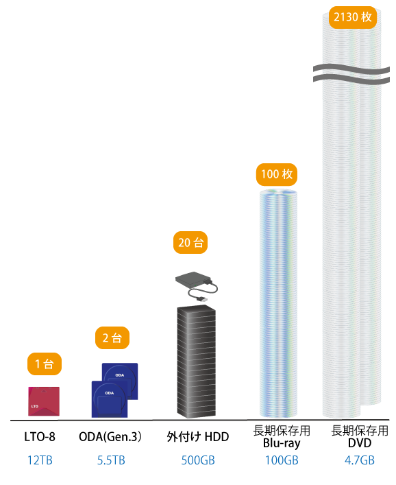 大容量の記録メディアにデータを移行することにより、データの保管場所を削減することができます。