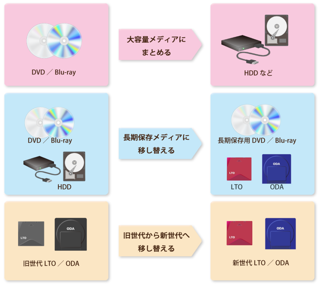 また、既存の記録メディアから 大容量のメディアへ移行することで、記録メディアの保管場所を削減できることもデータマイグレーションのメリットの一つです。