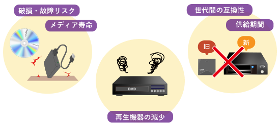 例えば、 メディアの寿命が長くとも、対応している再生機・ドライブがなければ中身のデータを読み込むことはできません。すなわち、再生機器の供給・保守期間も考慮する必要があります。