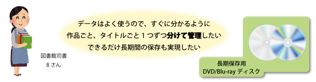 通常のDVD/Blu-ray用のドライブで読み込み可能(※)なため、HDDと同様に扱いやすさに優れていますが、1枚あたりの容量は4.7GB~100GBと他の長期保存用メディアよりも限られます。視聴覚資料1点に対して、1枚のディスクに格納して運用・管理をする場合に適しています。
